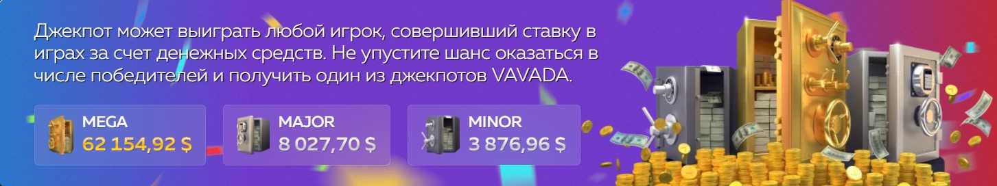В преддверии Нового 2023 года Vavada Casino решило порадовать своих игроков и ввела на постоянной основе новую бонусную акцию. Встречайте — Джекпоты в Вавада казино. Побороться за него смогут все игроки, совершая любые по размеру ставки в абсолютно любых слотах и live играх. Джекпоты от Vavada будут падать ежедневно! Сумма джекпота накапливается до момента падения, непрерывно увеличиваясь каждую секунду.